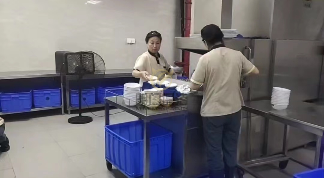 1、洗碗筐从洗碗机中自然推出来后,需先搬运到洗碗台边晾吹10秒钟以上,方可收捡入餐具筐内。