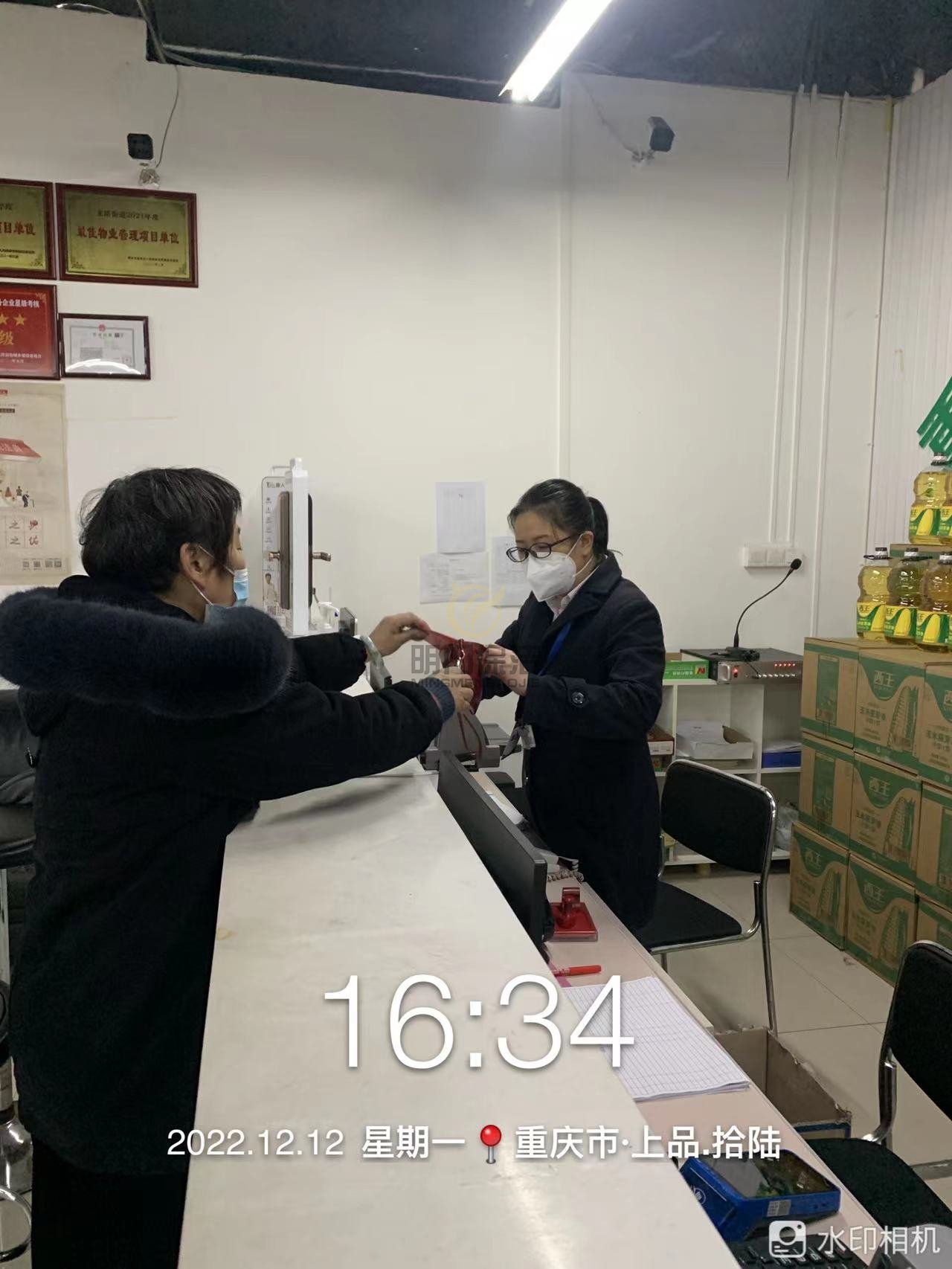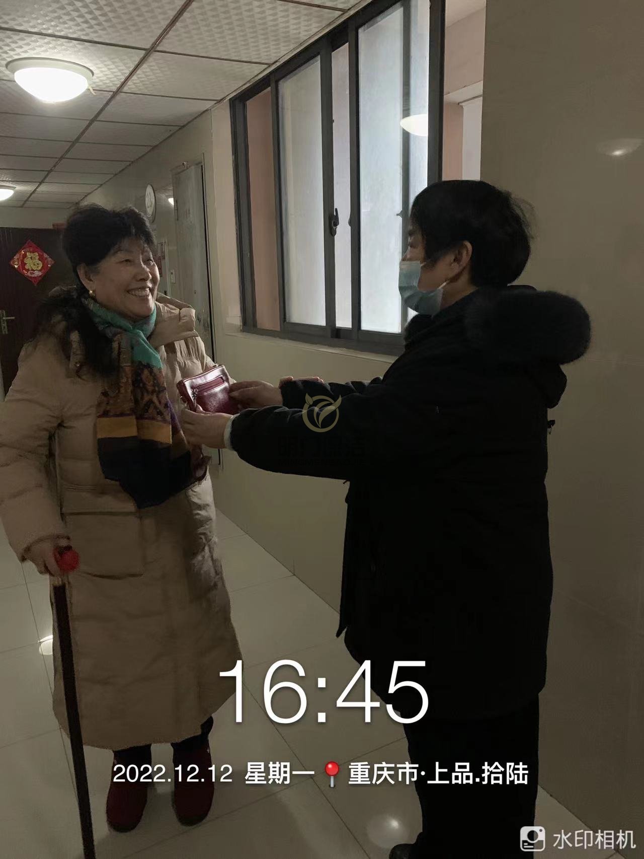 12月12日下午,向大姐像往常一样巡查扫地,走到休闲区域时,看到椅子上面掉了一个红色的钱包。她心想丢失钱包的失主此刻一定非常着急,便立即将钱包上交给领班邓姐,领班邓姐拿到钱包第一时间交给物业前台,物业的工作人员通过微信群,大约半花了小时左右找到了失主,是小区1栋23楼的刘阿姨,腿脚不方便。领班邓姐得知这个消息时说:“我帮刘阿姨拿送上去吧!”当邓姐用双手帮钱包送到刘阿姨手上时,刘阿姨脸上也露出喜悦的微笑!