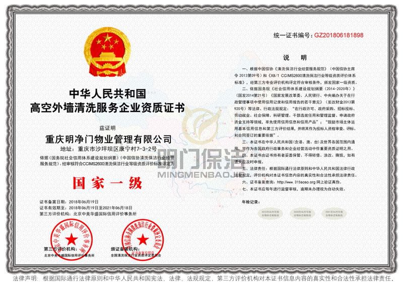 高空外墙清洗证书