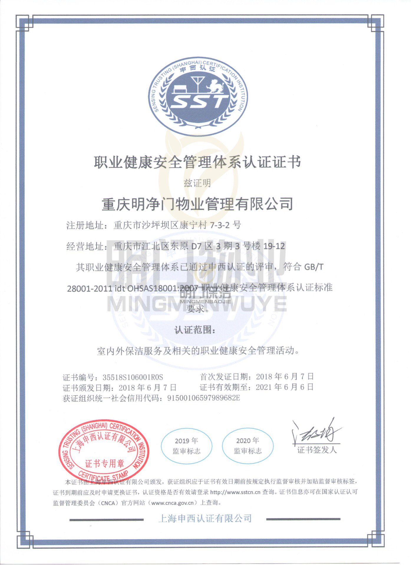 职业健康安全管理体系认证证书